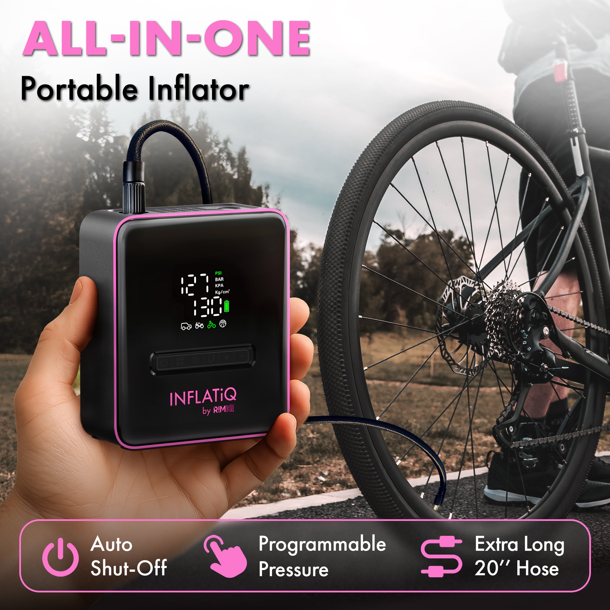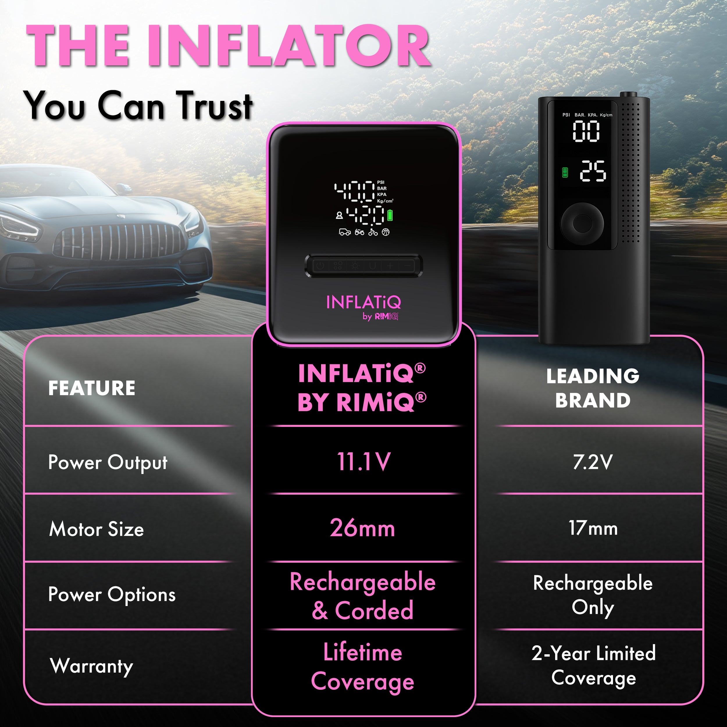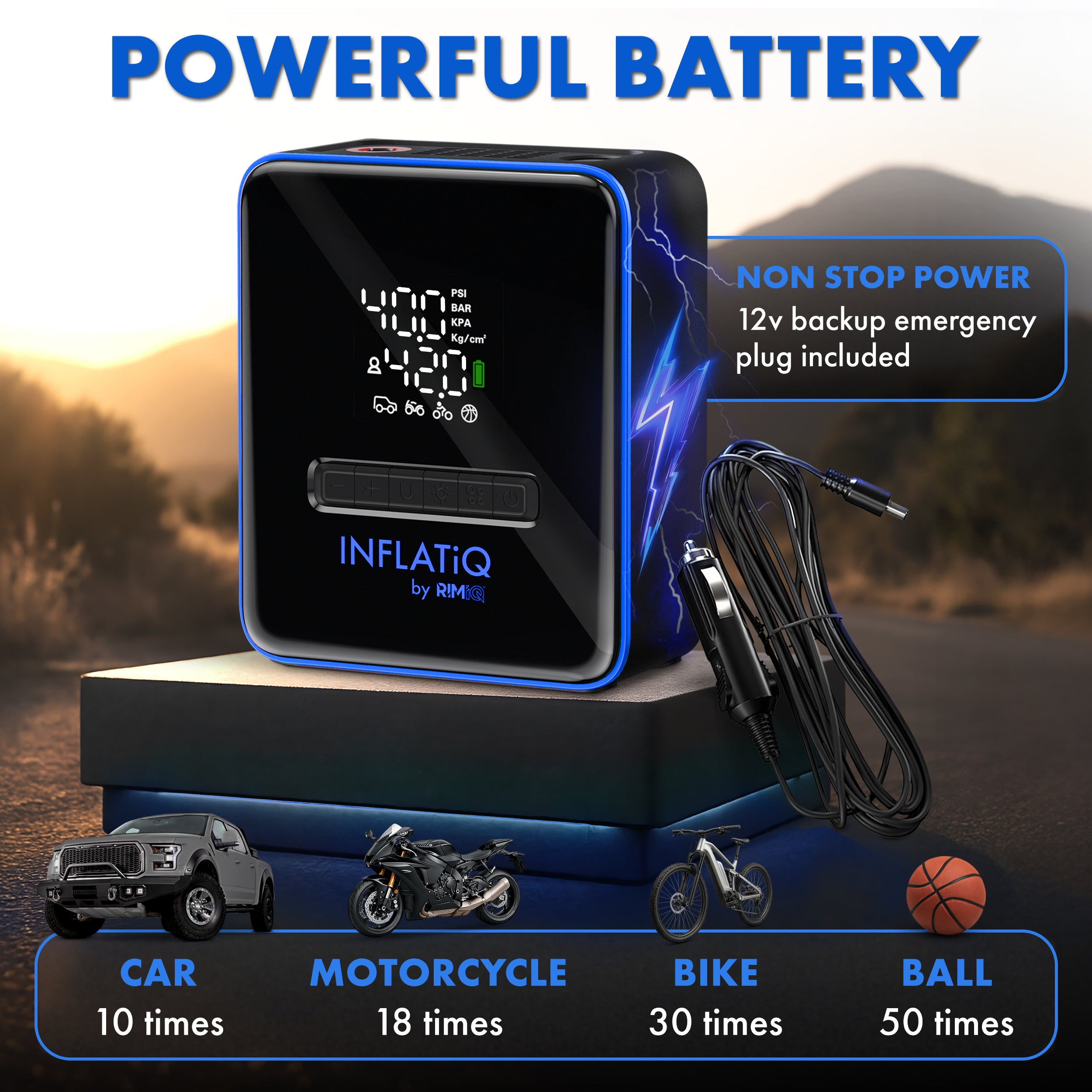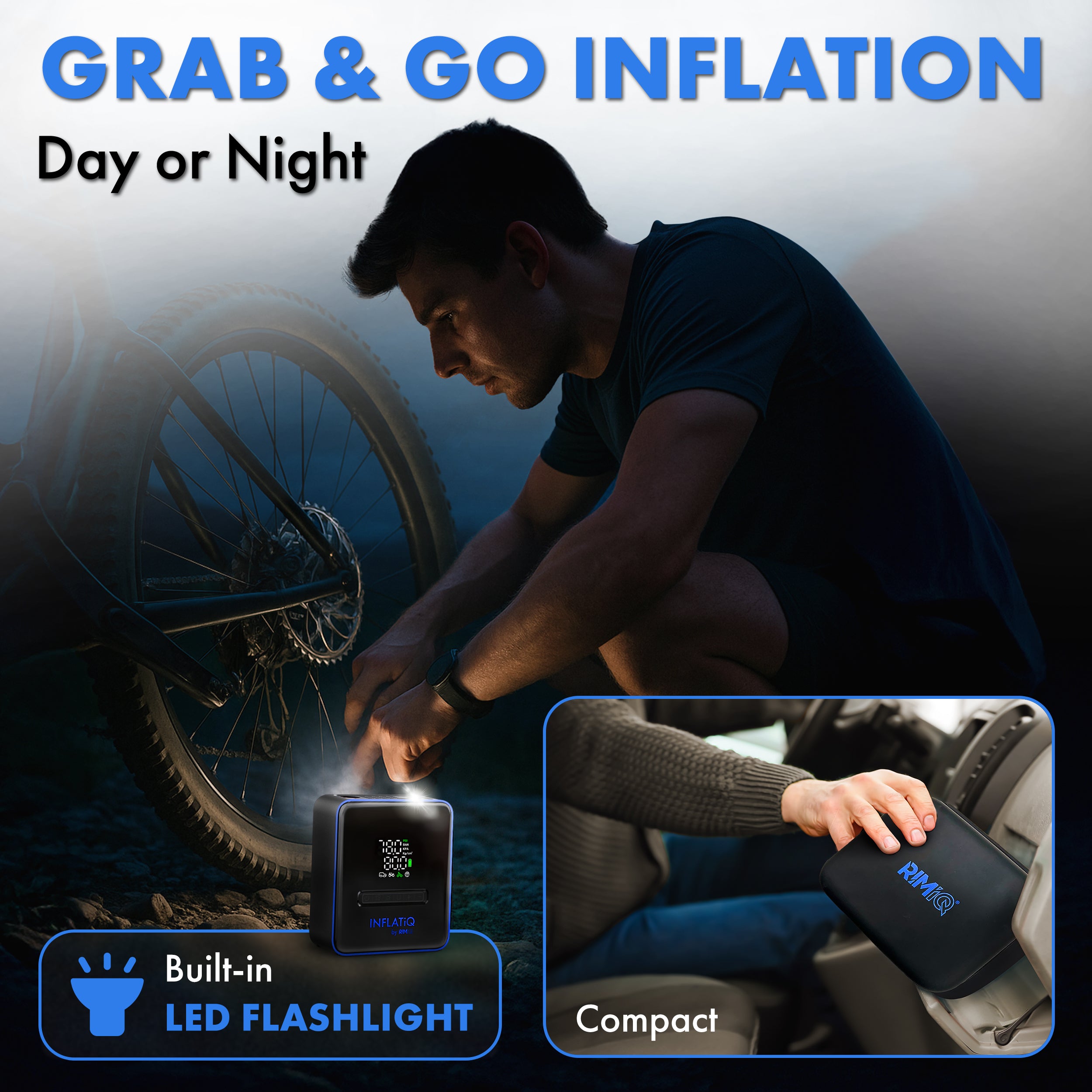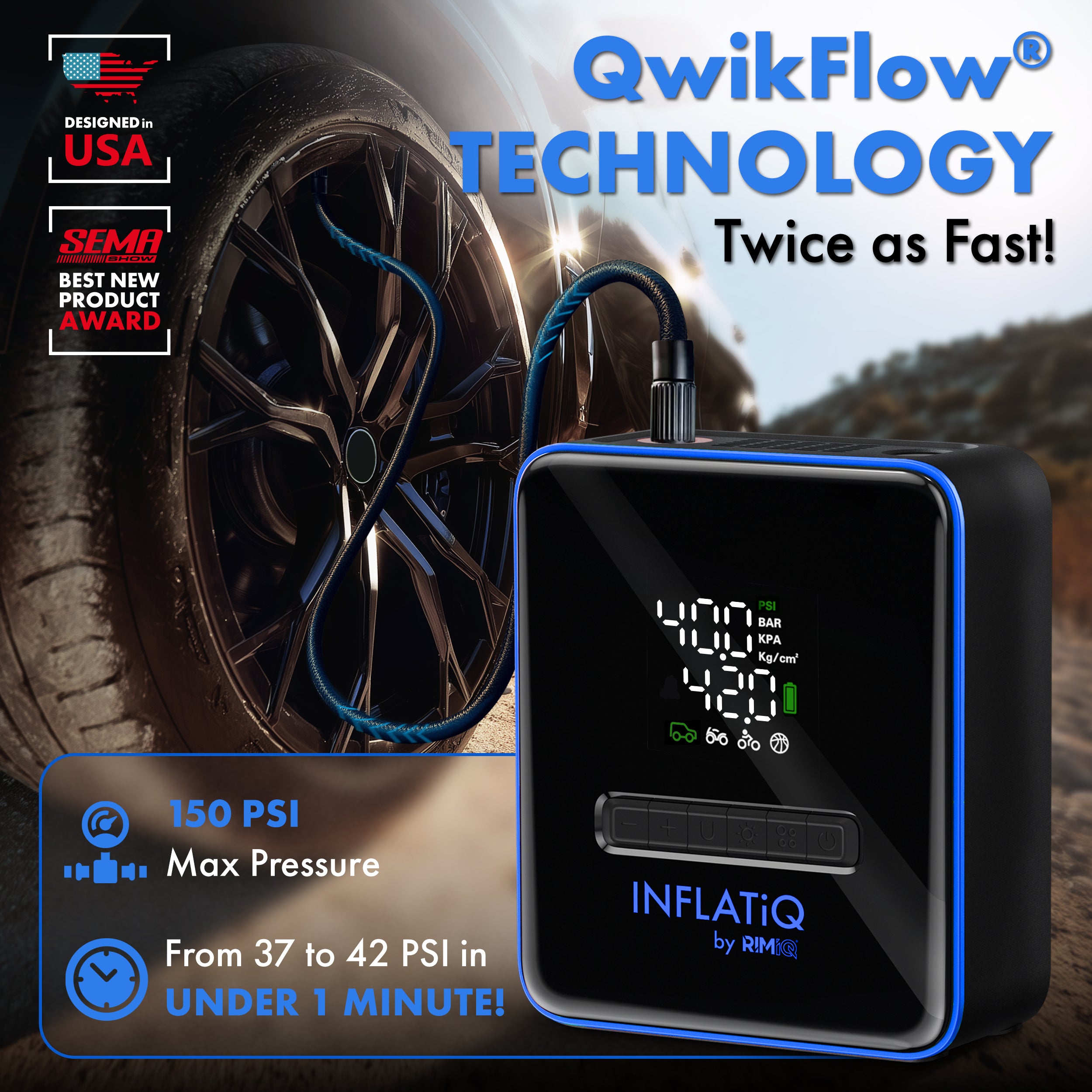USE COUPON "SAVE40" AT CHECKOUT! Experience the ultimate inflation solution with the INFLATiQ® by RIMiQ®. Powered by Twice as Fast QwikFlow® Technology, this portable tire inflator air compressor provides exceptional speed and efficiency, inflating car tires, bicycles, sporting balls, and more with ease.