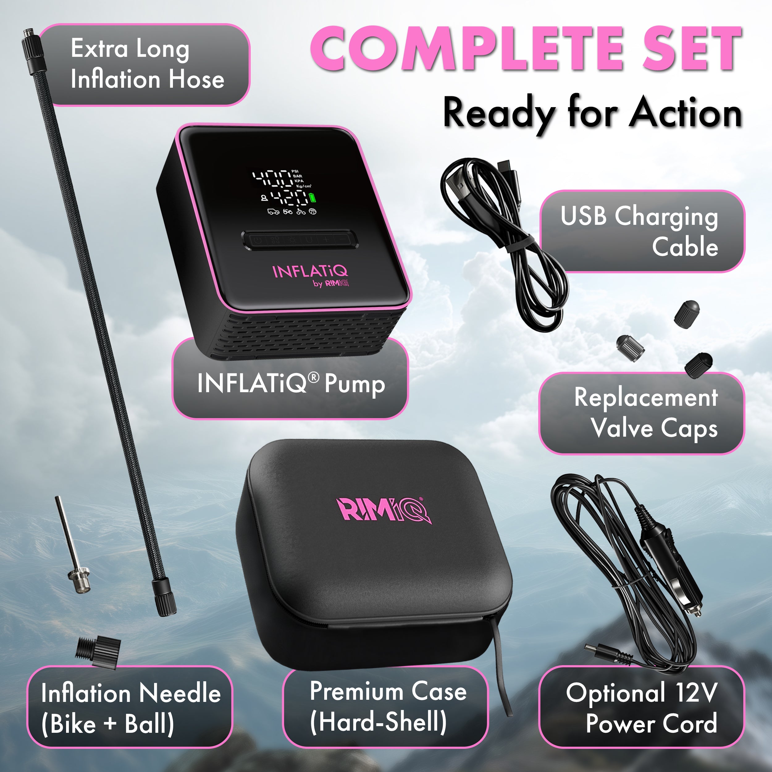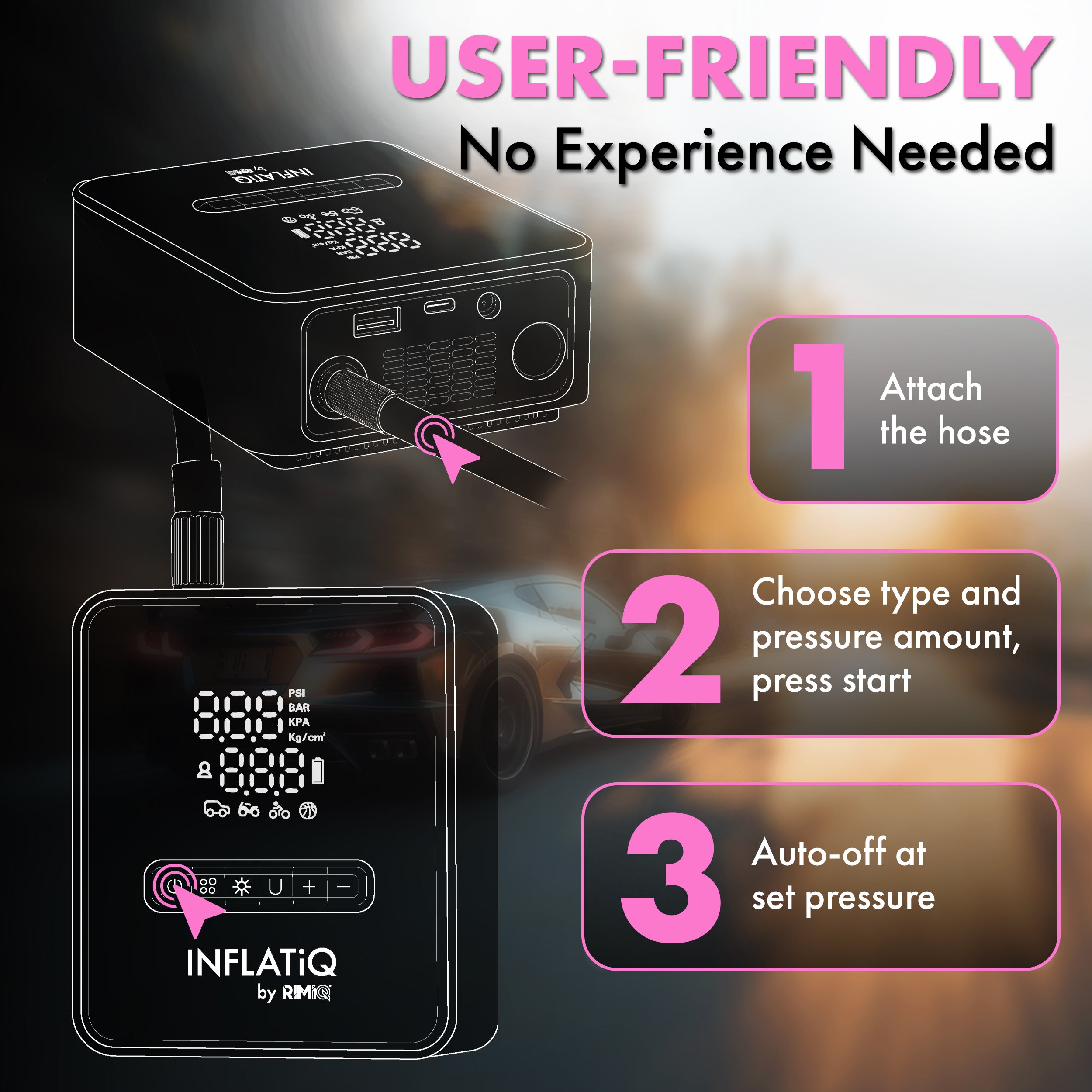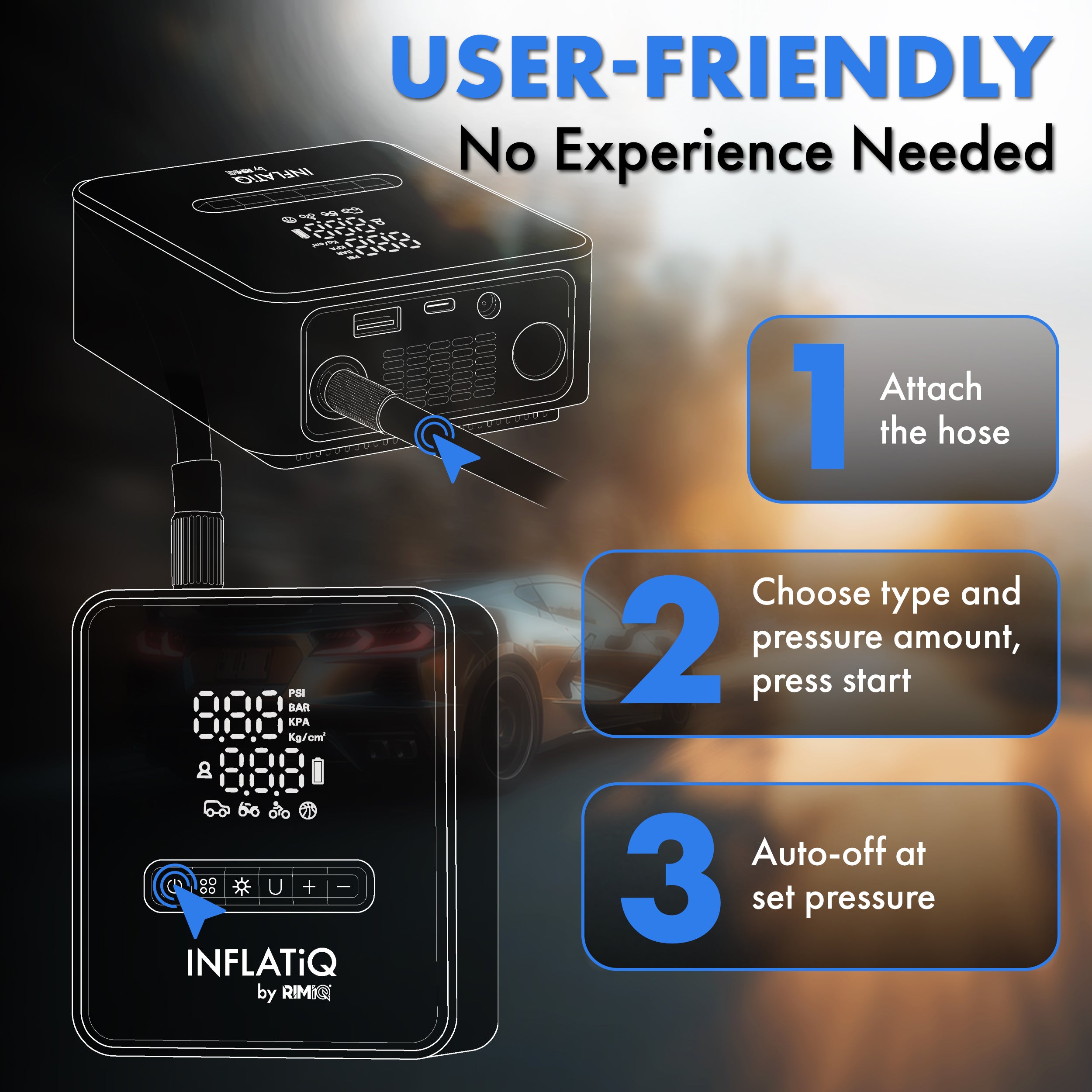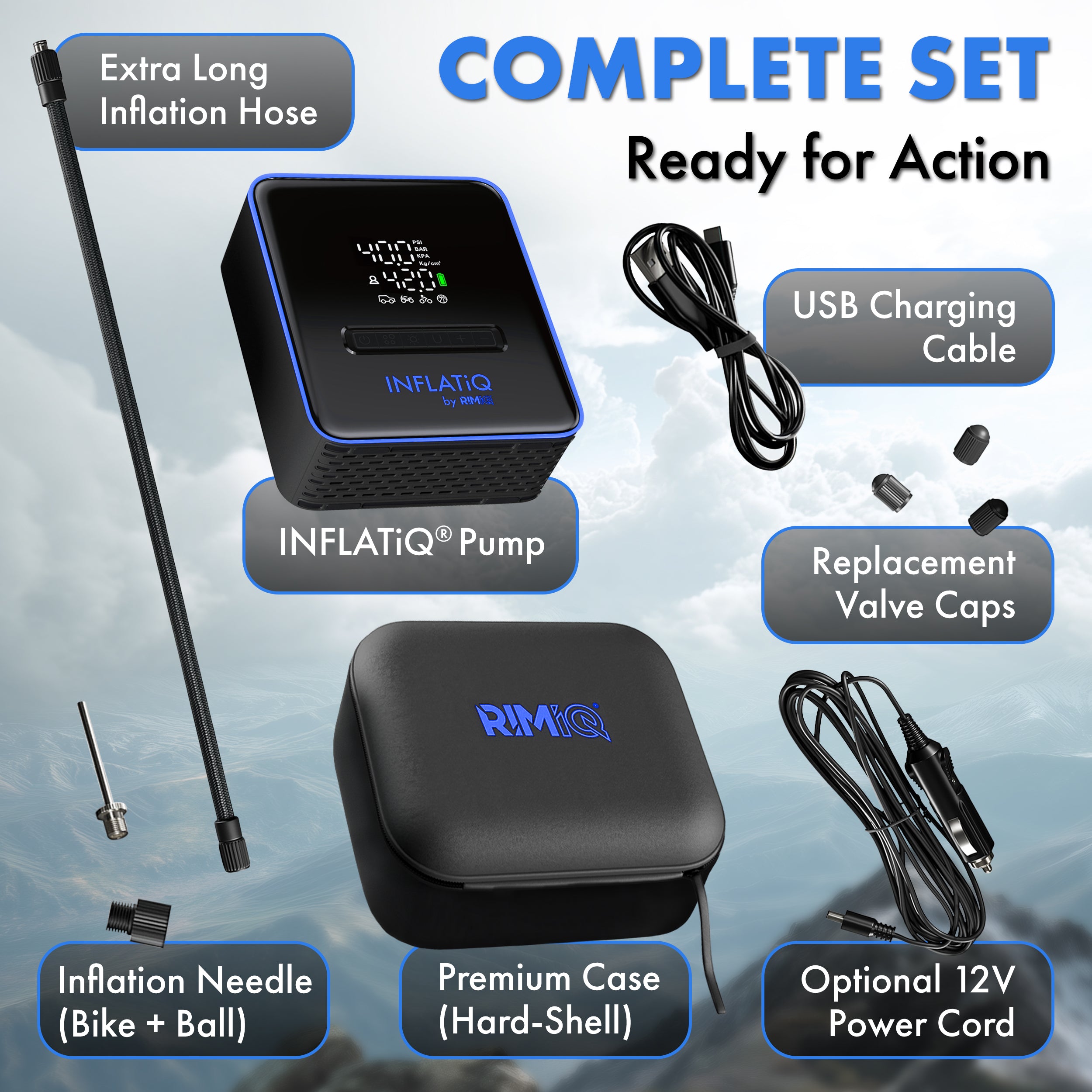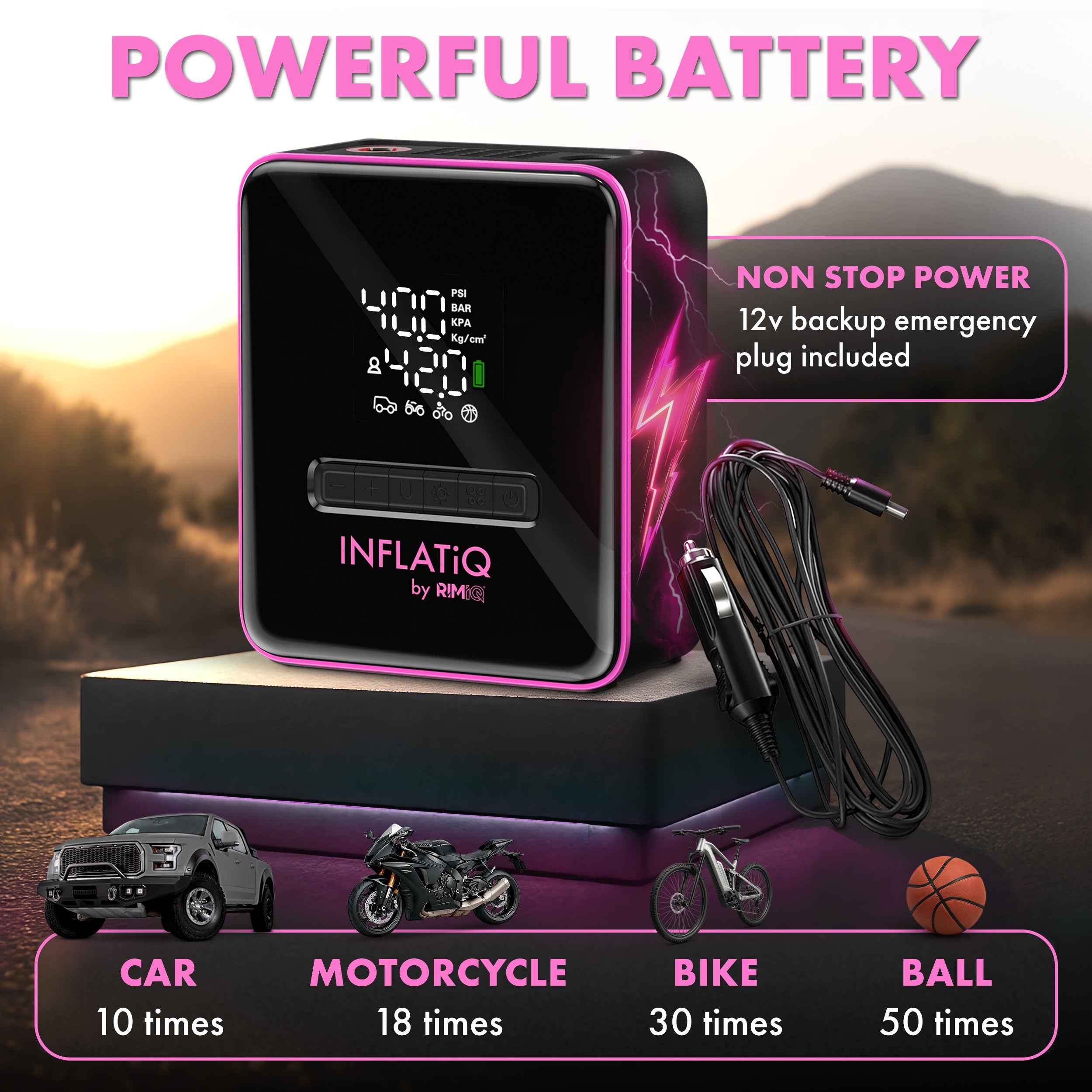 USE COUPON "SAVE40" AT CHECKOUT! Experience the ultimate inflation solution with the INFLATiQ® by RIMiQ®. Powered by Twice as Fast QwikFlow® Technology, this portable tire inflator air compressor provides exceptional speed and efficiency, inflating car tires, bicycles, sporting balls, and more with ease.